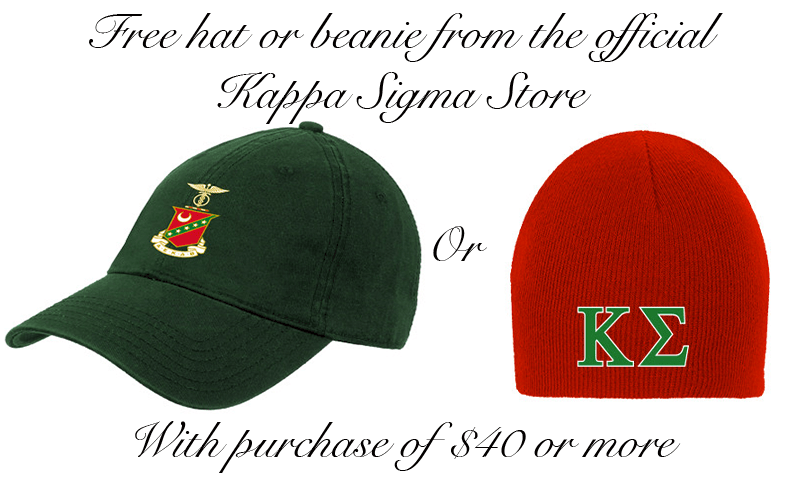 This holiday season the Kappa Sigma web store is happy to offer a free hat or free beanie with a personal credit card purchase of $40 or more. Limit one promo per order. This offer ends 12/31/2015. Use promo code 4062 for the beanie or promo code 4063 for the hat. Visit the Official Kappa Sigma web store today at store.kappasigma.org to claim this offer.